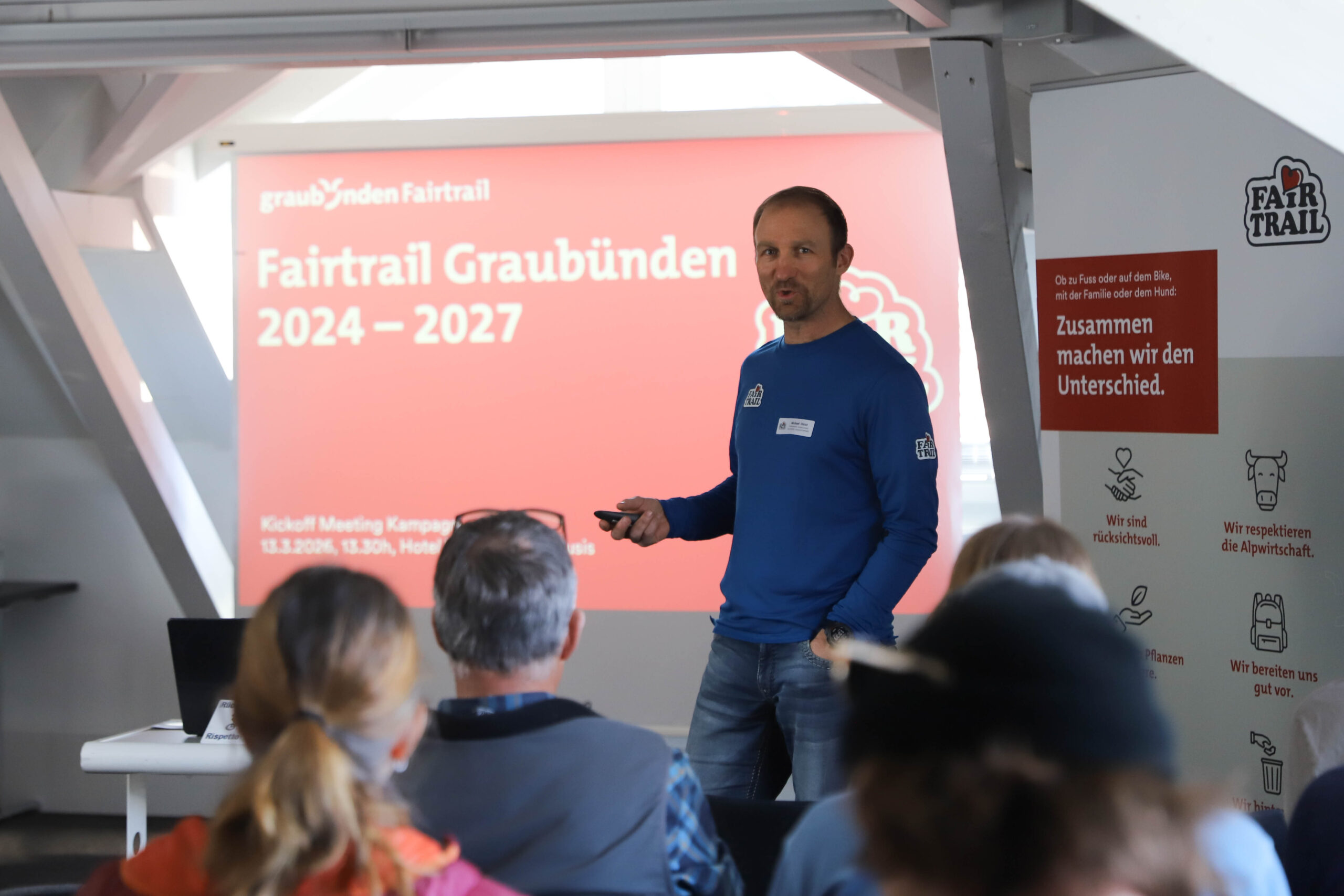 Am 13.3.2026 trafen sich in Thusis die zentralen Akteurinnen und Akteure von Fairtrail zum Kickoff 2026. Die Botschaft des Nachmittags war klar: Zusammen machen wir den Unterschied. Fairtrail wirkt nur, wenn alle mitziehen – Destinationen, Produktmanagement, Fairdinands im Feld, Ämter, Gemeinden, Leistungsträger und Projektpartner.